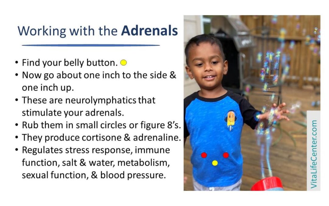 In your own body — the adrenals produce corticosteroid hormones that regulate the balance of salt and water, stress response, metabolism, immune function, and sexual development and function. They are important to keep healthy! When you are feeling low on energy, have been ill and are recovering, or simply want to maintain your resilience, work with these points on yourself! The ‘one inch to the side and one inch up’ refers to adults and the positioning will be less than an inch for children…you might use the index finer, middle finger and thumb together for the gentle massage – thus ‘covering more ground’.
